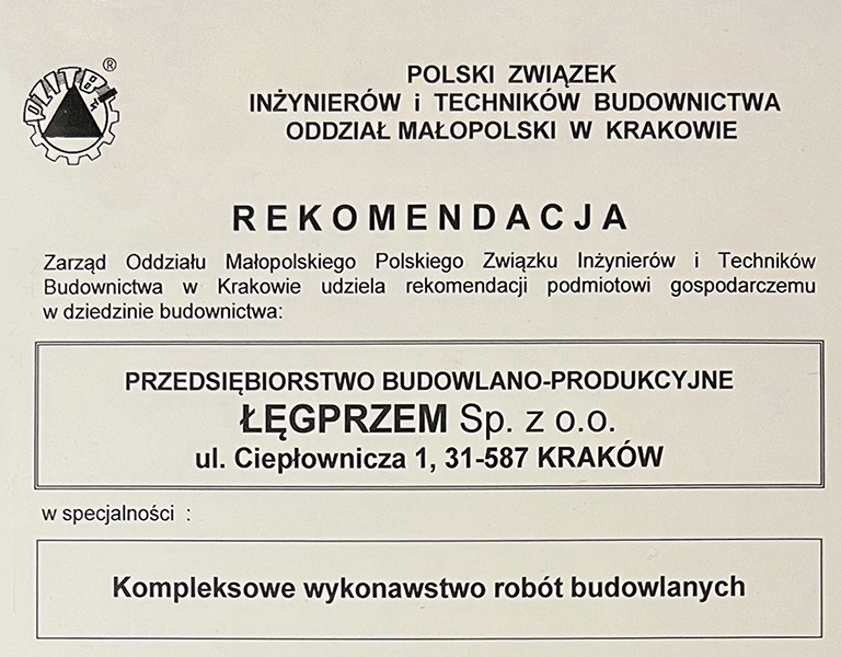 Nasza firma otrzymała rekomendację od Polskiego Związku Inżynierów i Techników Budownictwa w Krakowie.